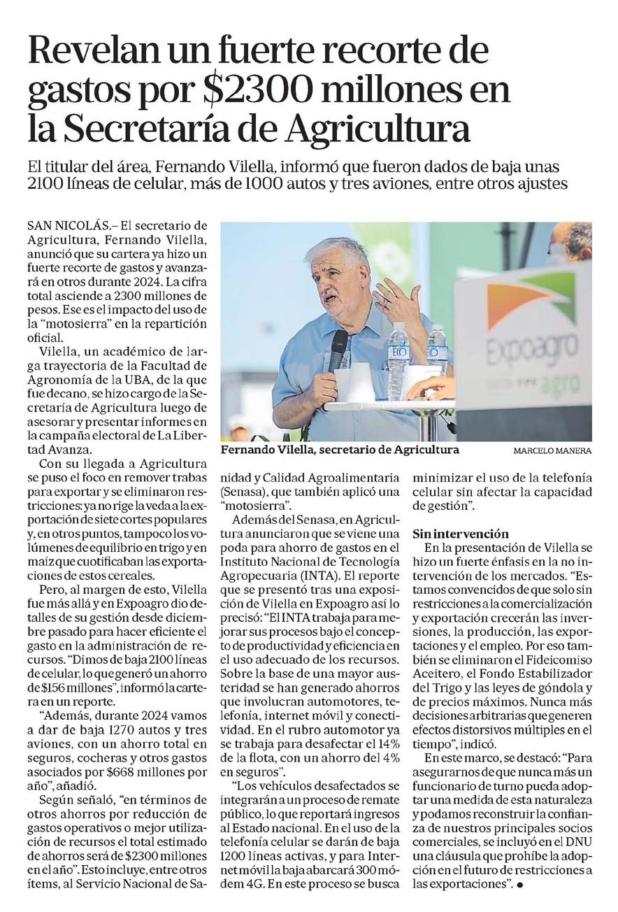 El titular del área, Fernando Vilella, informó que fueron dados de baja unas 2100 líneas de celular, más de 1000 autos y tres aviones, entre otros ajustesFernando Vilella, secretario de AgriculturaSAN NICOLÁS.- El secretario de Agricultura, Fernando Vilella, anunció que su cartera ya hizo un fuerte recorte de gastos y avanzará en otros durante 2024. La cifra total asciende a 2300 millones de pesos. Ese es el impacto del uso de la «motosierra» en la repartición oficial.Vilella, un académico de larga trayectoria de la Facultad de Agronomía de la UBA, de la que fue decano, se hizo cargo de la Secretaría de Agricultura luego de asesorar y presentar informes en la campaña electoral de La Libertad Avanza.Con su llegada a Agricultura se puso el foco en remover trabas para exportar y se eliminaron restricciones: ya no rige la veda a la exportación de siete cortes populares y, en otros puntos, tampoco los volúmenes de equilibrio en trigo y en maíz que cuotificaban las exportaciones de estos cereales.Pero, al margen de esto, Vilella fue más allá y en Expoagro dio detalles de su gestión desde diciembre pasado para hacer eficiente el gasto en la administración de recursos. «Dimos de baja 2100 líneas de celular, lo que generó un ahorro de $156 millones», informó la cartera en un reporte.»Además, durante 2024 vamos a dar de baja 1270 autos y tres aviones, con un ahorro total en seguros, cocheras y otros gastos asociados por $668 millones por año», añadió.Según señaló, «en términos de otros ahorros por reducción de gastos operativos o mejor utilización de recursos el total estimado de ahorros será de $2300 millones en el año». Esto incluye, entre otros ítems, al Servicio Nacional de Sanidad y Calidad Agroalimentaria (Senasa), que también aplicó una «motosierra».Además del Senasa, en Agricultura anunciaron que se viene una poda para ahorro de gastos en el Instituto Nacional de Tecnología Agropecuaria (INTA). El reporte que se presentó tras una exposición de Vilella en Expoagro así lo precisó: «El INTA trabaja para mejorar sus procesos bajo el concepto de productividad y eficiencia en el uso adecuado de los recursos. Sobre la base de una mayor austeridad se han generado ahorros que involucran automotores, telefonía, internet móvil y conectividad. En el rubro automotor ya se trabaja para desafectar el 14% de la flota, con un ahorro del 4% en seguros».»Los vehículos desafectados se integrarán a un proceso de remate público, lo que reportará ingresos al Estado nacional. En el uso de la telefonía celular se darán de baja 1200 líneas activas, y para Internet móvil la baja abarcará 300 módem 4G. En este proceso se busca minimizar el uso de la telefonía celular sin afectar la capacidad de gestión».Sin intervención En la presentación de Vilella se hizo un fuerte énfasis en la no intervención de los mercados. «Estamos convencidos de que solo sin restricciones a la comercialización y exportación crecerán las inversiones, la producción, las exportaciones y el empleo. Por eso también se eliminaron el Fideicomiso Aceitero, el Fondo Estabilizador del Trigo y las leyes de góndola y de precios máximos. Nunca más decisiones arbitrarias que generen efectos distorsivos múltiples en el tiempo», indicó.En este marco, se destacó: «Para asegurarnos de que nunca más un funcionario de turno pueda adoptar una medida de esta naturaleza y podamos reconstruir la confianza de nuestros principales socios comerciales, se incluyó en el DNU una cláusula que prohíbe la adopción en el futuro de restricciones a las exportaciones».