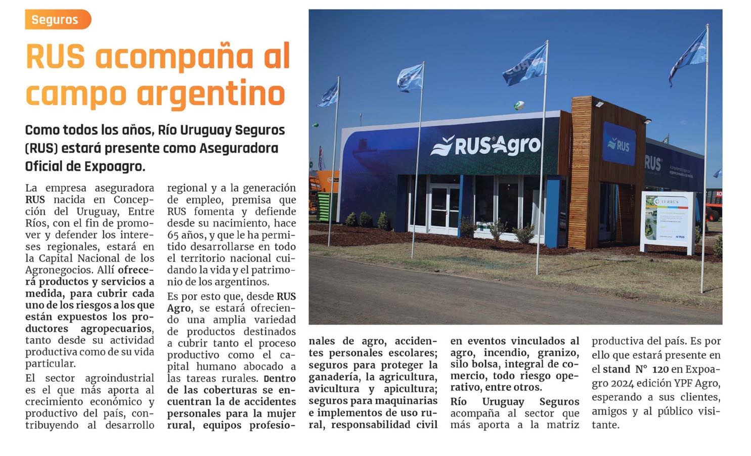 Como todos los años, Río Uruguay Seguros (RUS] estará presente como Aseguradora Oficial de Expoagro.La empresa aseguradora RUS nacida en Concepción del Uruguay, Entre Ríos, con el fin de promover y defender los intereses regionales, estará en la Capital Nacional de los Agronegocios. Allí ofrecerá productos y servicios a medida, para cubrir cada uno de los riesgos a los que están expuestos los productores agropecuarios, tanto desde su actividad productiva como de su vida particular.El sector agroindustrial es el que más aporta al crecimiento económico y productivo del país, contribuyendo al desarrollo regional y a la generación de empleo, premisa que RUS fomenta y defiende desde su nacimiento, hace 65 años, y que le ha permitido desarrollarse en todo el territorio nacional cuidando la vida y el patrimonio de los argentinos.Es por esto que, desde RUS Agro, se estará ofreciendo una amplia variedad de productos destinados a cubrir tanto el proceso productivo como el capital humano abocado a las tareas rurales. Dentro de las coberturas se encuentran la de accidentes personales para la mujer rural, equipos profesio- RUS Agro nales de agro, accidentes personales escolares; seguros para proteger la ganadería, la agricultura, avicultura y apicultura; seguros para maquinarias e implementos de uso rural, responsabilidad civil en eventos vinculados al agro, incendio, granizo, silo bolsa, integral de comercio, todo riesgo operativo, entre otros.Río Uruguay Seguros acompaña al sector que más aporta a la matriz productiva del país. Es por ello que estará presente en el stand N° 120 en Expoagro 2024 edición YPF Agro, esperando a sus clientes, amigos y al público visitante.