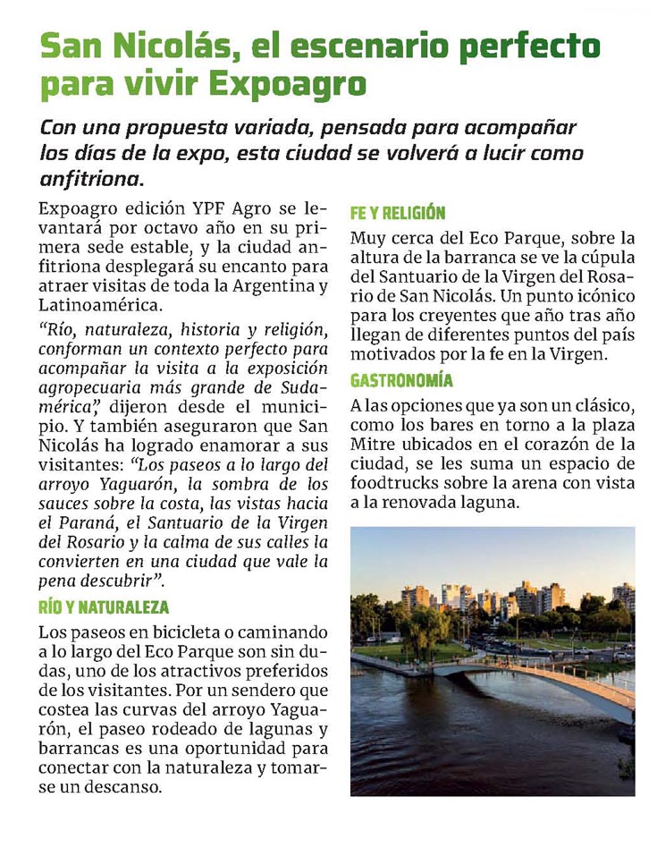 «Río, naturaleza, historia y religión, conforman un contexto perfecto para acompañar la visita a la exposición agropecuaria más grande de Suda- mérica’’ dijeron desde el municipio. Y también aseguraron que San Nicolás ha logrado enamorar a sus visitantes: «Los paseos a lo largo del arroyo Yaguarón, la sombra de los sauces sobre la costa, las vistas hacia el Paraná, el Santuario de la Virgen del Rosario y la calma de sus calles la convierten en una ciudad que vale la pena descubrir».