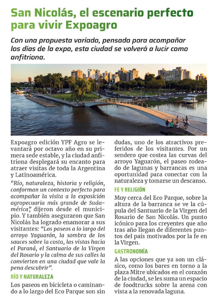 «Río, naturaleza, historia y religión, conforman un contexto perfecto para acompañar la visita a la exposición agropecuaria más grande de Súdame rica» dijeron desde el municipio. Y también aseguraron que San Nicolás ha logrado enamorar a sus visitantes: «Los paseos a lo largo del arroyo Yaguarón, la sombra de los sauces sobre la costa, las vistas hacia el Paraná, el Santuario de la Virgen del Rosario y la calma de sus calles la convierten en una ciudad que vale la pena descubrir».