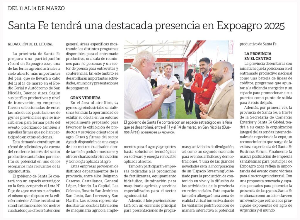 Además, por primera vez, la provincia de Santa Fe, a través de la Secretaría de Comercio Exterior y Santa Fe Global, tendrá a su cargo la organización integral de las rondas internacionales de negocios de la expo, un reconocimiento que surge de la exitosa experiencia del Santa Fe Business Forum. Finalmente, la masiva postulación de empresas santafesinas para participar de Expoagro 2025 refleja la importancia del evento como vidriera para el sector agroindustrial. Con una propuesta renovada y espacios pensados para potenciar la presencia de las pymes, Santa Fe se afianza como un actor clave en un evento que reúne a los principales exponentes del agro de Argentina y el mundo.