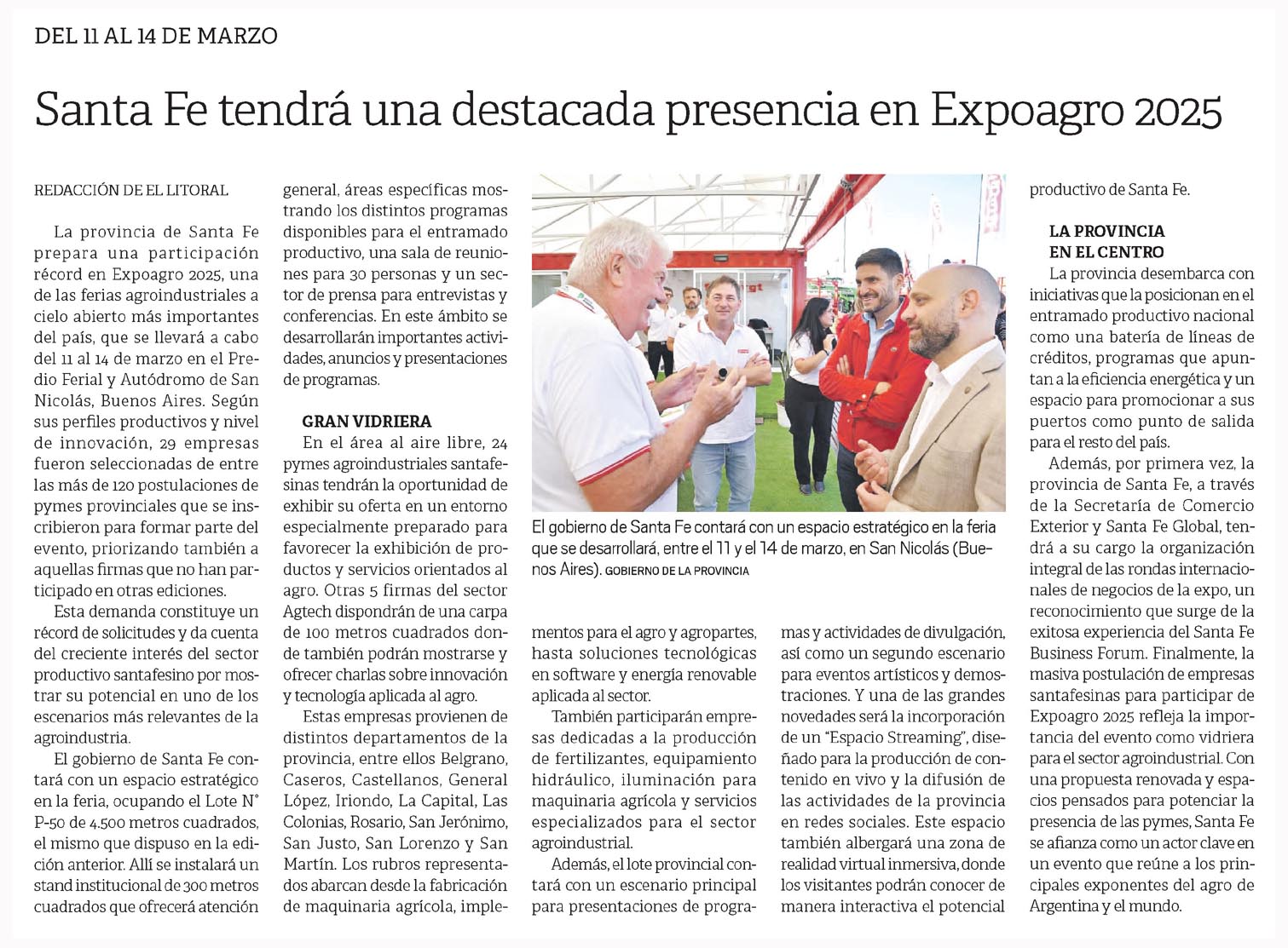 Además, por primera vez, la provincia de Santa Fe, a través de la Secretaría de Comercio Exterior y Santa Fe Global, tendrá a su cargo la organización integral de las rondas internacionales de negocios de la expo, un reconocimiento que surge de la exitosa experiencia del Santa Fe Business Forum. Finalmente, la masiva postulación de empresas santafesinas para participar de Expoagro 2025 refleja la importancia del evento como vidriera para el sector agroindustrial. Con una propuesta renovada y espacios pensados para potenciar la presencia de las pymes, Santa Fe se afianza como un actor clave en un evento que reúne a los principales exponentes del agro de Argentina y el mundo.