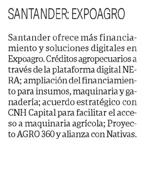 Santander ofrece más financiamiento y soluciones digitales en Expoagro. Créditos agropecuarios a través de la plataforma digital NERA; ampliación del financiamiento para insumos, maquinaria y ganadería; acuerdo estratégico con CNH Capital para facilitar el acceso a maquinaria agrícola; Proyecto AGRO 360 y alianza con Nativas.