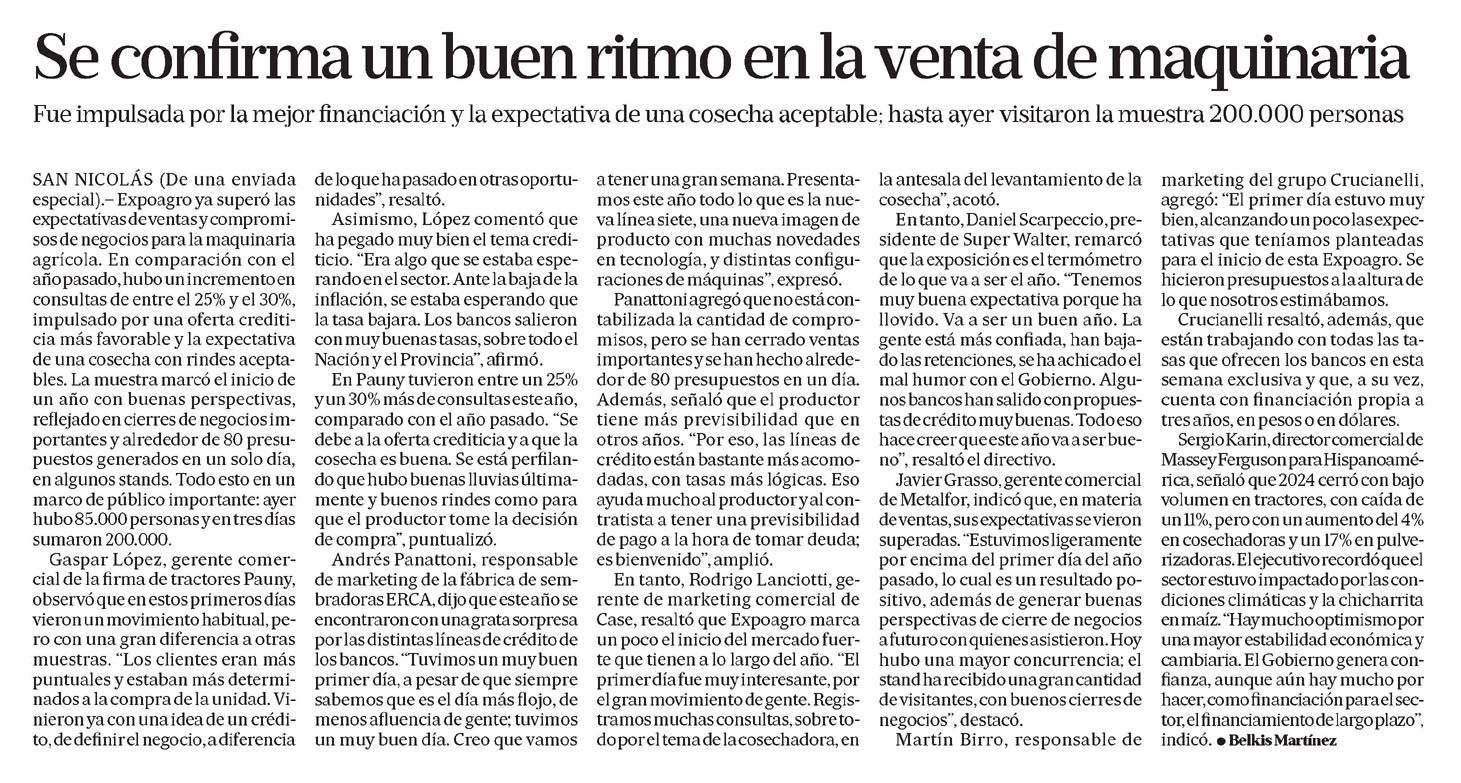 …SAN NICOLÁS (De una enviada especial).- Expoagro ya superó las expectativas de ventas y compromisos de negocios para la maquinaria agrícola. En comparación con el año pasado, hubo un incremento en consultas…