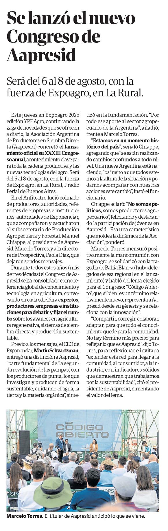 …Este jueves en Expoagro 2025 edición YPF Agro, continuando la zaga de novedades que se ofrecen a diario, la Asociación Argentina de Productores en Siembra Directa (Aapresid)…