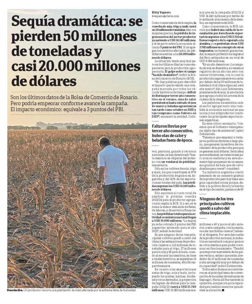 Como consecuencia de la sequía, la cosecha de soja, trigo y maíz caerá en 50 millones de toneladas. Aún con mayores precios, la pérdida de ingresos netos del sector productor ya asciende a USD 14.140 millones, y el impacto sobre la economía alcanza 3 puntos del PBI. Si se agregan los servicios afectados, las pérdidas se acercan a los 20.000 millones de dólares.