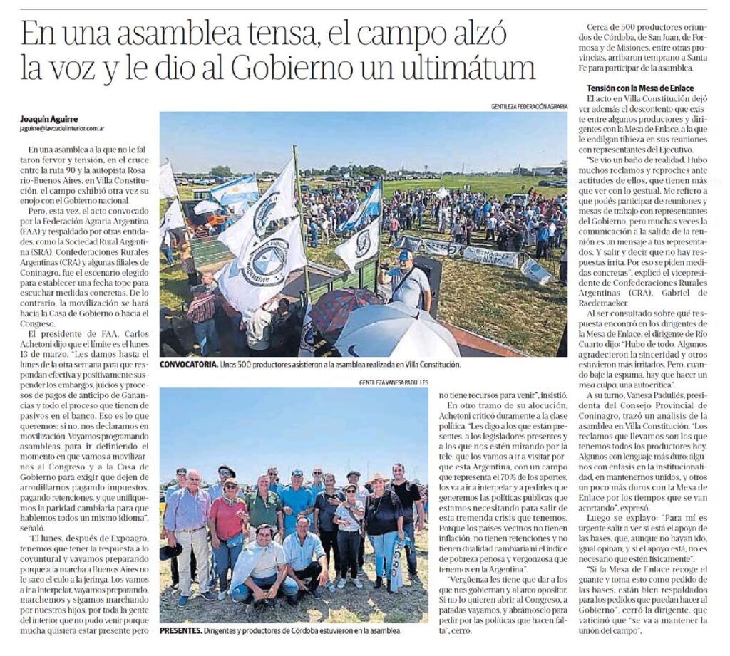 La entidad federada tomó esa decisión al término de la asamblea de productores que convocó sobre la autopista Rosario – Buenos Aires y la ruta 90, a la altura de Villa Constitución, de la cual no sólo participaron las distintas delegaciones de FAA sino además la dirigencia del resto de la mesa de enlace, es decir Sociedad Rural Argentina, Confederaciones Rurales Argentinas y Coninagro, cuyos presidentes fueron parte del encuentro.