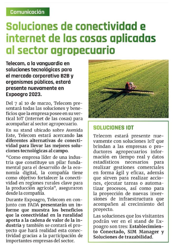 Telecom estará presente nuevamente con soluciones IoT que brindan a las empresas o productores agropecuarios información en tiempo real y datos estadísticos necesarios para realizar gestiones comerciales en forma ágil y eficaz, además que sirven para realizar acciones, ejecutar tareas o automatizar procesos, así como para la proyección de nuevas inversiones de infraestructura que acompañen al crecimiento del proyecto.