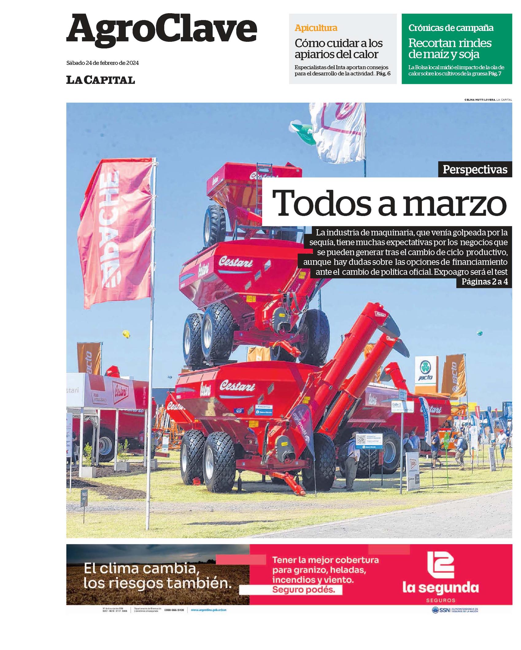 Apicultura Cómo cuidar a los apiarios del calor Especialistas del Inta aportan consejos para el desarrollo de la actividad . Pág. 6Crónicas de campaña Recortan rindes de maíz y soja La Bolsa local midió el impacto de la ola de calor sobre los cultivos de la gruesa Pág. 7Perspectivas Todos a marzo La industria de maquinaria, que venía golpeada por la sequía, tiene muchas expectativas por los negocios que se pueden generar tras el cambio de ciclo productivo, aunque hay dudas sobre las opciones de financiamiento ante el cambio de política oficial. Expoagro será el test Páginas 2 a 4