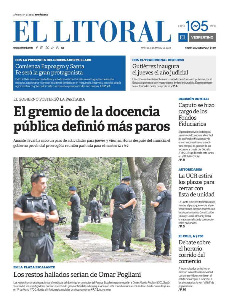 EL GOBIERNO POSTERGÓ LA PARITARIAEl gremio de la docencia pública definió más parosAmsafe llevará a cabo un paro de actividades para jueves y viernes. Horas después del anuncio, el gobierno provincial prorrogó la reunión paritaria para el martes 12. / P. 9EN LA PLAZA ESCALANTELos restos hallados serían de Omar PoglianiLos restos humanos descubiertos el mediodía del domingo en un sector del Parque escalante pertenecerían a Omar Alberto Pogliani (70). Según trascendió, los investigadores habrían encontrado gran cantidad de indicios que vinculan este macabro suceso con lo descubierto horas después en 1° de mayo 4700, donde el infortunado alquilaba un departamento. / P. 15. FLAVIO RAINACON LA PRESENCIA DEL GOBERNADOR PULLAROComienza Expoagro y Santa Fe será la gran protagonistaDel 5 al 8 de marzo, el predio ferial y autódromo de san Nicolás será el lugar para desarrollar negocios, capacitarse y conocer las últimas tendencias en maquinaria, insumos y servicios para la agroindustria. el gobernador Pullaro recibirá al ex presidente Macri en rosario. / P. 2 y 3CON EL TRADICIONAL DISCURSOGutiérrez inaugura el jueves el año judicialEl acto formal se desarrolla en un contexto de reformas impulsadas por el ejecutivo provincial con impacto en el ámbito tribunalicio. Estarán presentes autoridades de los tres poderes. / P. 4DECISIÓN DE MILEICaputo se hizo cargo de los Fondos FiduciariosEl presidente Milei le delegó al ministro de economía el control de los Fondos Fiduciarios y le encomendó realizar una auditoría integral de gestión de los recursos, a través del decreto 215/2024 publicado este lunes en el Boletín oficial. / P. 8AUTORIDADESLa UCR estira los plazos para cerrar con lista de unidadLa Junta electoral trasladó a este martes el plazo que vencía el pasado viernes. restan acuerdos en los departamentos Constitución y Garay. Corral, orciani y Borla encabezan la lista de convencionales nacionales. / P. 5EL COLE, A $ 700Debate sobre el horario corrido del comercioA los empleados se les incrementan los costos de movilidad. Los consumidores no tienen el hábito de comprar a la siesta. Y los empresarios lo ven «difícil» de implementar. / P. 10