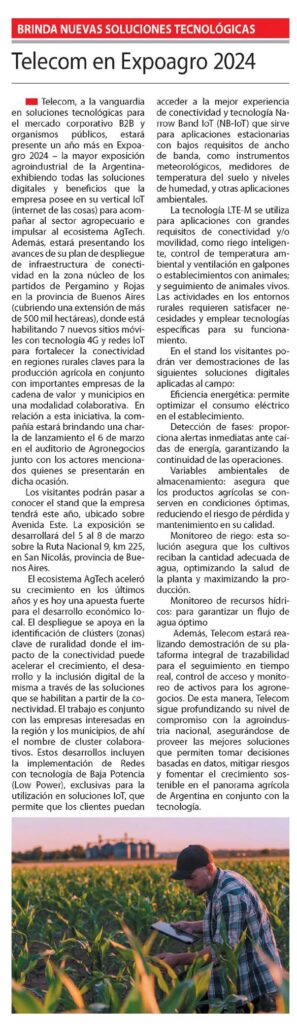 Telecom, a la vanguardia en soluciones tecnológicas para el mercado corporativo B2B y organismos públicos, estará presente un año más en Expoagro 2024 – la mayor exposición agroindustrial de la Argentinaexhibiendo todas las soluciones digitales y beneficios que la empresa posee en su vertical loT (internet de las cosas) para acompañar al sector agropecuario e impulsar al ecosistema AgTech. Además, estará presentando los avances de su plan de despliegue de infraestructura de conectividad en la zona núcleo de los partidos de Pergamino y Rojas en la provincia de Buenos Aires (cubriendo una extensión de más de 500 mil hectáreas), donde está habilitando 7 nuevos sitios móviles con tecnología 4G y redes loT para fortalecer la conectividad en regiones rurales claves para la producción agrícola en conjunto con importantes empresas de la cadena de valor y municipios en una modalidad colaborativa. En relación a esta iniciativa, la compañía estará brindando una charla de lanzamiento el 6 de marzo en el auditorio de Agronegocios junto con los actores mencionados quienes se presentarán en dicha ocasión.