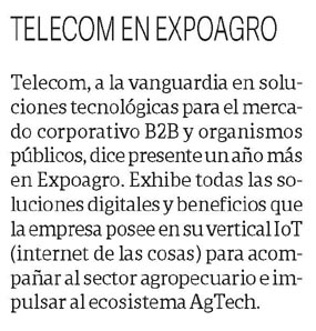 Telecom, a la vanguardia en soluciones tecnológicas para el mercado corporativo B2B y organismos públicos, dice presente un año más en Expoagro. Exhibe todas las soluciones digitales y beneficios que la empresa posee en su vertical IoT (internet de las cosas) para acompañar al sector agropecuario e impulsar al ecosistema AgTech.