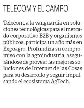 Telecom, a la vanguardia en soluciones tecnológicas para el mercado corporativo B2B y organismos públicos, participa un año más en Expoagro. Profundiza su compromiso con la agroindustria, asegurándose de proveer las mejores soluciones de Internet de las Cosas para su desarrollo y seguir impulsando el ecosistema AgTech.