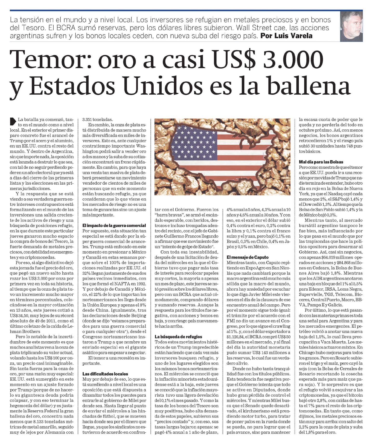 La tensión en el mundo y a nivel local. Los inversores se refugian en metales preciosos y en bonos del Tesoro. El BCRA sumó reservas, pero los dólares libres subieron. Wall Street cae, las acciones argentinas sufren y los bonos locales ceden, con nueva suba del riesgo país.