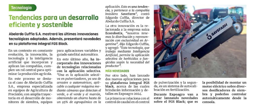 Abelardo Cuffia S.A. mostrará las últimas innovaciones tecnológicas adoptadas. Además, presentará novedades en su plataforma integral FGS Black.En un contexto en constante evolución, la innovación, la tecnología y la inteligencia artificial que incorporan y aplican las compañías, cumplen un rol central para optimizar la producción agrícola. En este proceso se destaca el caso de Abelardo Cuffia S.A., empresa especializada en equipos de Agricultura de Precisión; con amplia trayectoria en el desarrollo de monitores de siembra, equipos para aplicaciones variables y guiado satelital automático. En este último año, ha incorporado dos innovaciones de tecnologías relacionadas con la aplicación selectiva. «Una es la aplicación selectiva en pulverizadores, ya sea de arrastre o automotrices, aplicable a cualquier máquina mediante cámaras que detectan el verde, o el verde y el marrón, obteniendo un ahorro hasta de un 95% de agroquímico en la aplicación. Esto es una tendencia, y pertenece a la compañía brasilera SaveFarm», contó Edgardo Cuffia, director de Abelardo Cuffia S.A.La otra innovación es la relacionada a la empresa suiza Ecorobotix, «nosotros tenemos la distribución y representación con exclusividad en Argentina», dijo Edgardo Cuffia, y agregó: «Esta tecnología, que trabaja mediante Inteligencia Artificial, permite la aplicación selectiva de herbicidas o fungicidas según la necesidad del productor».MÁS NOVEDADES Por otro lado, han lanzado dos nuevas aplicaciones para su plataforma integral FGS black, acerca de las cuales brindarán información y detalles en Expoagro 2024.La primera se relaciona con el control de caudal en el control de pulverización y la segunda, es un sistema de autocali- bración en fertilización. Durante Expoagro van a estar lanzando novedades sobre el FGS Black; que es la posibilidad de montar un motor eléctrico sobre diversos dosificadores de siembra y poderlos controlar automáticamente desde la consola.