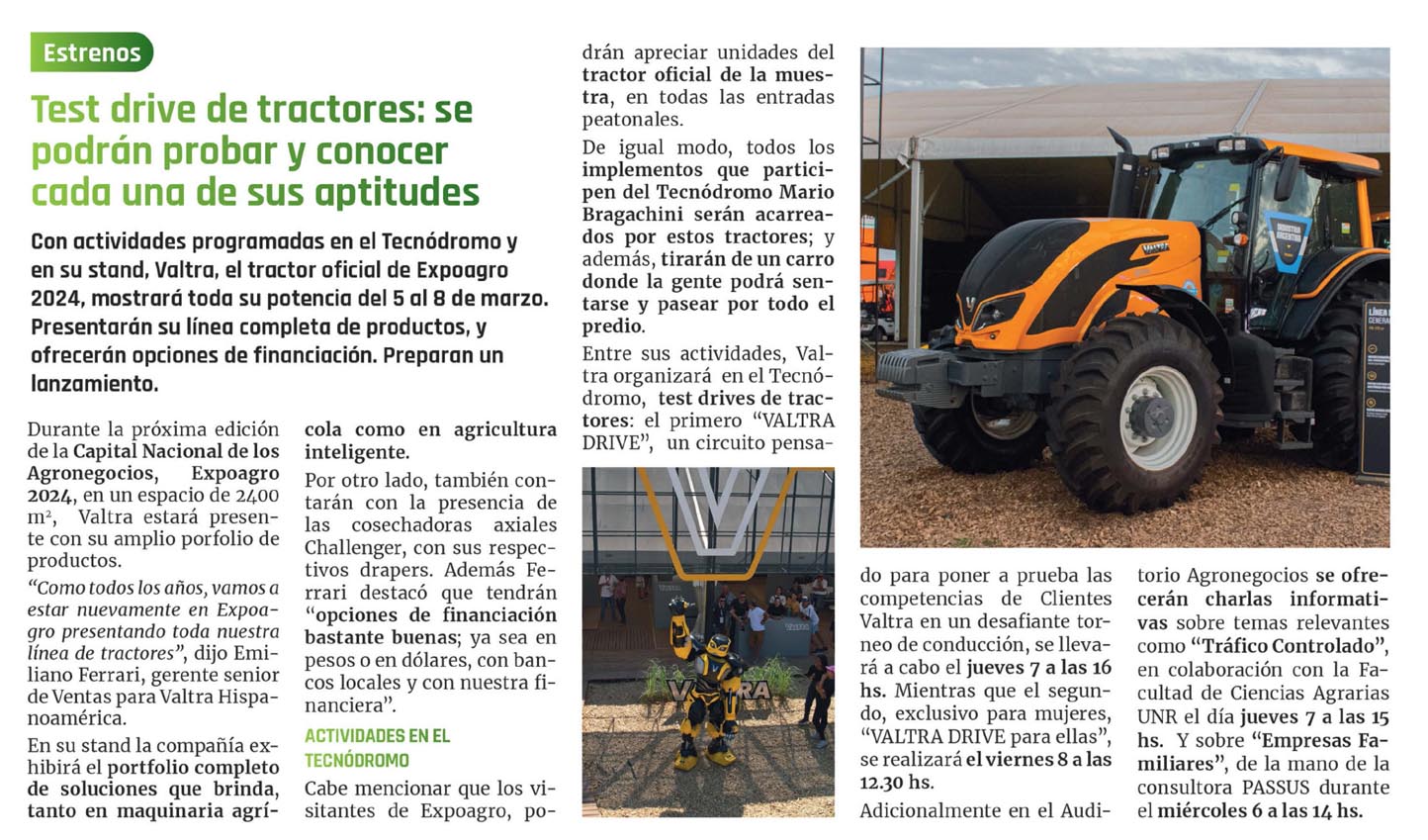 Con actividades programadas en el Tecnódromo y en su stand, Valtra, el tractor oficial de Expoagro 2024, mostrará toda su potencia del 5 al 8de marzo. Presentarán su línea completa de productos, y ofrecerán opciones de financiación. Preparan un lanzamiento.Durante la próxima edición de la Capital Nacional de los Agronegocios, Expoagro 2024, en un espacio de 2400 m2, Valtra estará presente con su amplio porfolio de productos.»Como todos los años, vamos a estar nuevamente en Expoagro presentando toda nuestra línea de tractores», dijo Emiliano Ferrari, gerente sénior de Ventas para Valtra Hispanoamérica.En su stand la compañía exhibirá el portfolio completo de soluciones que brinda, tanto en maquinaria agrícola como en agricultura inteligente.Por otro lado, también contarán con la presencia de las cosechadoras axiales Challenger, con sus respectivos drapers. Además Ferrari destacó que tendrán «opciones de financiación bastante buenas; ya sea en pesos o en dólares, con bancos locales y con nuestra financiera».ACTIVIDADES EN EL TECNÓDROMO Cabe mencionar que los visitantes de Expoagro, podrán apreciar unidades del tractor oficial de la muestra, en todas las entradas peatonales. De igual modo, todos los implementos que participen del Tecnódromo Mario Bragachini serán acarreados por estos tractores; y además, tirarán de un carro donde la gente podrá sentarse y pasear por todo el predio.Entre sus actividades, Valtra organizará en el Tecnódromo, test drives de tractores: el primero «VALTRA DRIVE», un circuito pensado para poner a prueba las competencias de Clientes Valtra en un desafiante torneo de conducción, se llevará a cabo el jueves 7 a las 16 hs. Mientras que el segundo, exclusivo para mujeres, «VALTRA DRI- VE para ellas», se realizará el viernes 8 a las 12.30 hs. Adicionalmente en el Auditorio Agronegocios se ofrecerán charlas informativas sobre temas relevantes como «Tráfico Controlado», en colaboración con la Facultad de Ciencias Agrarias UNR el día jueves 7 a las 15 hs. Y sobre «Empresas Familiares», de la mano de la consultora PASSUS durante el miércoles 6 a las 14 hs.