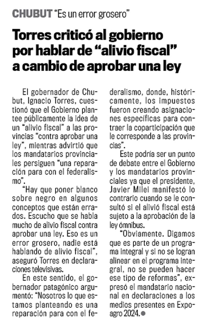 CHUBUT “Es un error grosero”Torres criticó al gobierno por hablar de “alivio fiscal” a cambio de aprobar una leyEl gobernador de Chu-but, Ignacio Torres, cuestionó que el Gobierno plantee públicamente la idea de un “alivio fiscal” a las provincias “contra aprobar una ley”, mientras advirtió que los mandatarios provinciales persiguen “una reparación para con el federalismo”. “Hay que poner blanco sobre negro en algunos conceptos que están errados. Escucho que se habla mucho de alivio fiscal contra aprobar una ley. Eso es un error grosero, nadie está hablando de alivio fiscal”, aseguró Torres en declaraciones televisivas.En este sentido, el gobernador patagónico argumentó: “Nosotros lo que estamos planteando es una reparación para con el fe-deralismo, donde, históricamente, los impuestos fueron creando asignaciones específicas para contraer la coparticipación que le corresponde a las provincias”.Este podría ser un punto de debate entre el Gobierno y los mandatarios provinciales ya que el presidente, Javier Milei manifestó lo contrario cuando se le consultó si el alivió fiscal está sujeto a la aprobación de la ley ómnibus.“Obviamente. Digamos que es parte de un programa integral y si no se logran alinear en el programa integral, no se pueden hacer ese tipo de reformas”, expresó el mandatario nacional en declaraciones a los medios presentes en Expoagro 2024,0