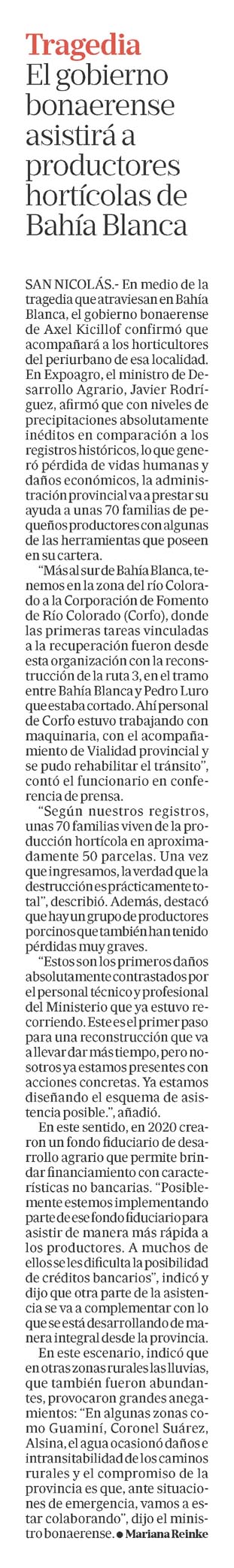 … que atraviesan en Bahía Blanca, el gobierno bonaerense de Axel Kicillof confirmó que acompañará a los horticultores del periurbano de esa localidad. En Expoagro, el ministro de Desarrollo Agrario, Javier Rodríguez, afirmó que con niveles de precipitaciones absolutamente inéditos en comparación a los registros…
