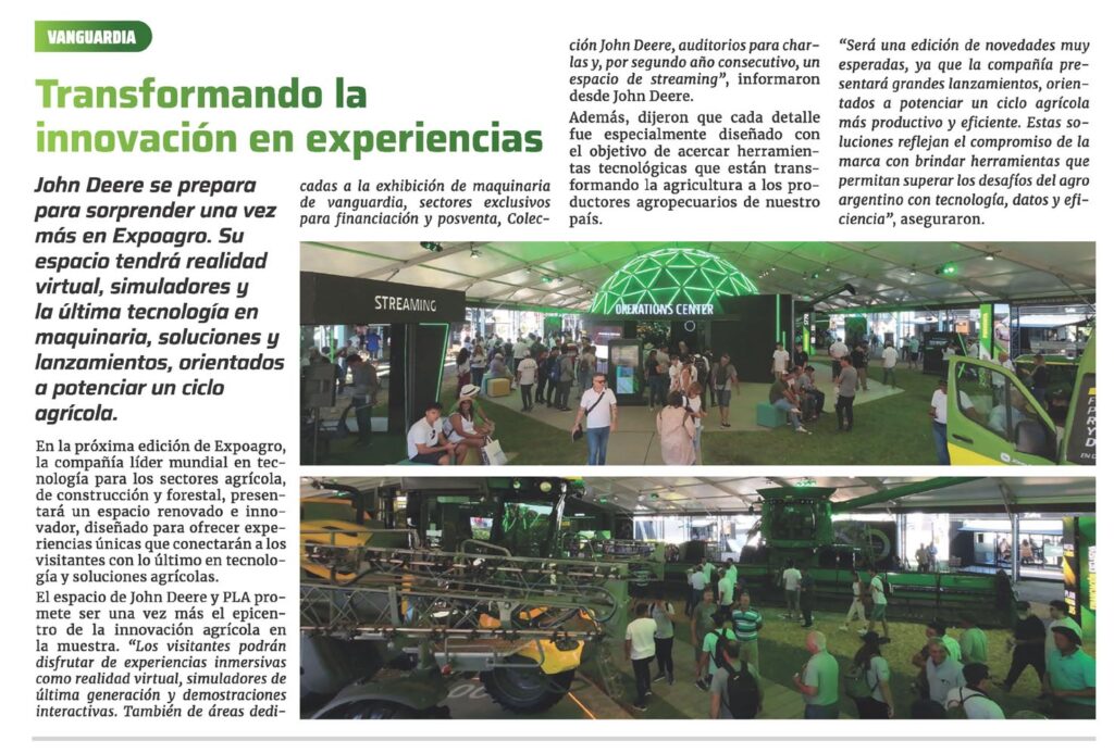 El espacio de John Deere y PLA promete ser una vez más el epicentro de la innovación agrícola en la muestra. «Los visitantes podrán disfrutar de experiencias inmersivas como realidad virtual, simuladores de última generación y demostraciones interactivas. También de áreas dedi cadas a la exhibición de maquinaria de vanguardia, sectores exclusivos para financiación y posventa, Colección John Deere, auditorios para charlas y, por segundo año consecutivo, un espacio de streaming», informaron desde John Deere.