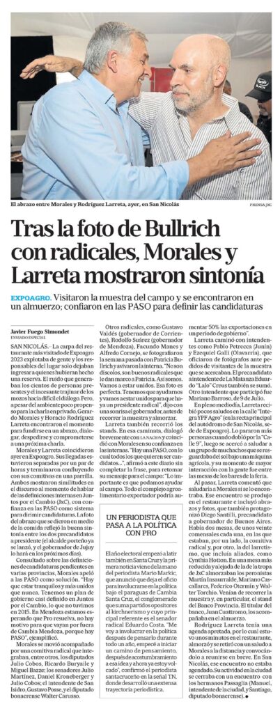 SAN NICOLÁS.? La carpa del restaurante más visitado de Expoagro 2023 explotaba de gente y los responsables del lugar solo dejaban ingresar a quienes hubieran hecho una reserva. El ruido que generaban los cientos de personas presentes y el incesante trajinar de los mozos hacía difícil el diálogo. Pero, a pesar del ambiente poco propenso para la charla en privado, Gerardo Morales y Horacio Rodríguez Larreta encontraron el momento para fundirse en un abrazo, dialogar, despedirse y comprometerse a una próxima charla.