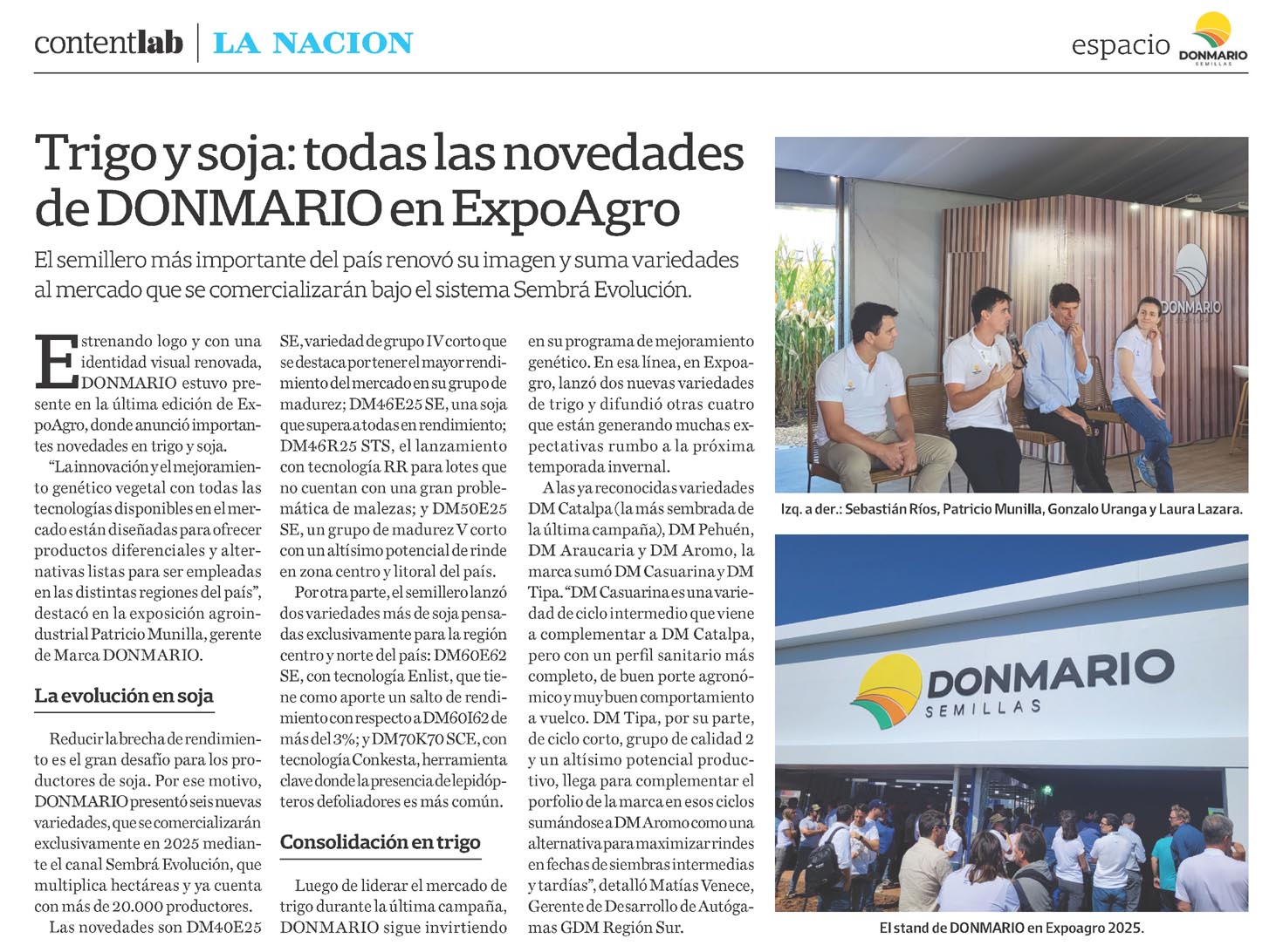 … Gerente de Desarrollo de Autóga- mas GDM Región Sur. Izq. a der.: Sebastián Ríos, Patricio Munilla, Gonzalo Uranga y Laura Lazara. El stand de DONMARIO en Expoagro 2025…
