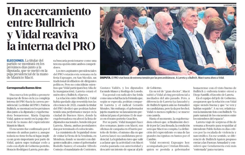 Corresponsalía Buenos Aires Una nueva foto política promete impactar de lleno en la ya compleja intema del PRO hacia la carrera presidencial. La titular del PRO, Patricia Bullrich, se mostrará en los próximos días junto a la diputada y exgobemadora bonaerense, María Eugenia Vidal, quien se metió en la puja electoral de la mano del expresidente Mauricio Macri.