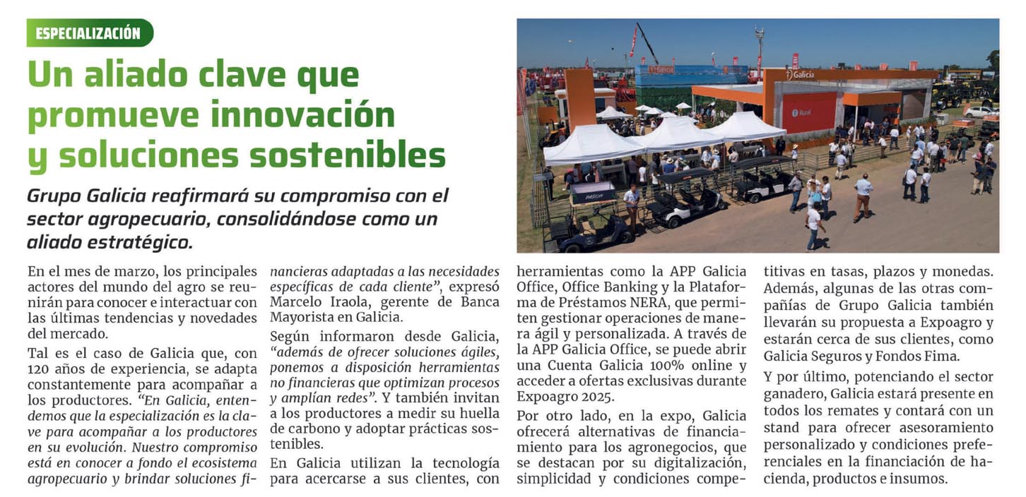 Un aliado clave que promueve innovación y soluciones sostenibles Grupo Galicia reafirmará su compromiso con el sector agropecuario, consolidándose como un aliado estratégico.