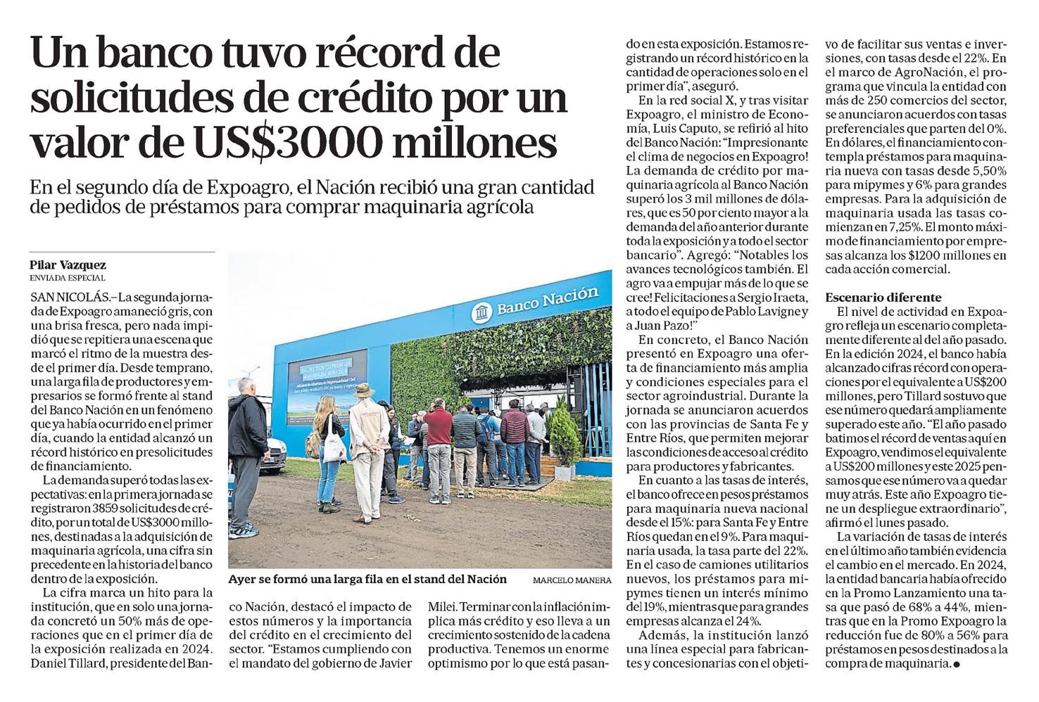 En la red social X, y tras visitar Expoagro, el ministro de Economía, Luis Caputo, se refirió al hito del Banco Nación: «Impresionante el clima de negocios en Expoagro! La demanda de crédito por maquinaria agrícola al Banco Nación superó los 3 mil millones de dólares, que es 50 por ciento mayor a la demanda del año anterior durante toda la exposición y a todo el sector bancario». Agregó: «Notables los avances tecnológicos también. El agro va a empujar más de lo que se cree! Felicitaciones a Sergio Iraeta, a todo el equipo de Pablo Lavigne y a Juan Pazo!» En concreto, el Banco Nación presentó en Expoagro una oferta de financiamiento más amplia y condiciones especiales para el sector agroindustrial. Durante la jornada se anunciaron acuerdos con las provincias de Santa Fe y Entre Ríos, que permiten mejorar las condiciones de acceso al crédito para productores y fabricantes.