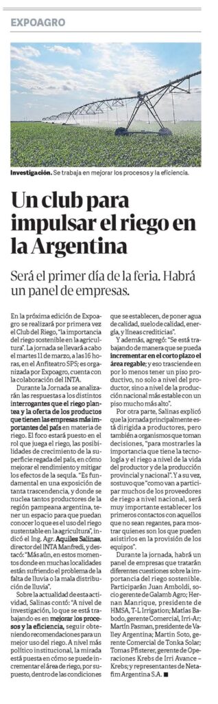 Participarán Juan Amboldi, socio gerente de Galamb Agro; Hernan Manrique, presidente de HMSA, T-L Irrigation; Matías Babodo, gerente Comercial, Irri-Ar; Martín Pasman, presidente de Valley Argentina; Martin Soto, gerente Comercial de Tonka Solar; Tomas Pfisterer, gerente de Operaciones Krebs de Irri Avance – Krebs; y representantes de Netafim Argentina S.A