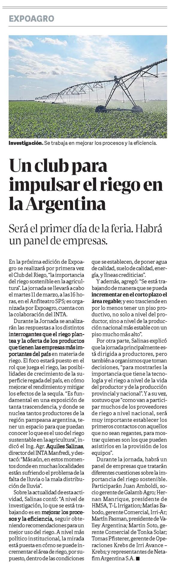 Participarán Juan Amboldi, socio gerente de Galamb Agro; Hernan Manrique, presidente de HMSA, T-L Irrigation; Matías Babodo, gerente Comercial, Irri-Ar; Martín Pasman, presidente de Valley Argentina; Martin Soto, gerente Comercial de Tonka Solar; Tomas Pfisterer, gerente de Operaciones Krebs de Irri Avance – Krebs; y representantes de Netafim Argentina S.A