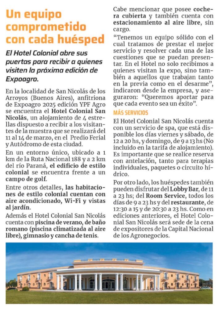 En la localidad de San Nicolás de los Arroyos (Buenos Aires), anfitriona de Expoagro 2025 edición YPF Agro se encuentra el Hotel Colonial San Nicolás, un alojamiento de 4 estrellas dispuesto a recibir a los visitantes de la muestra que se realizará del 11 al 14 de marzo, en el Predio Ferial y Autódromo de esta ciudad.