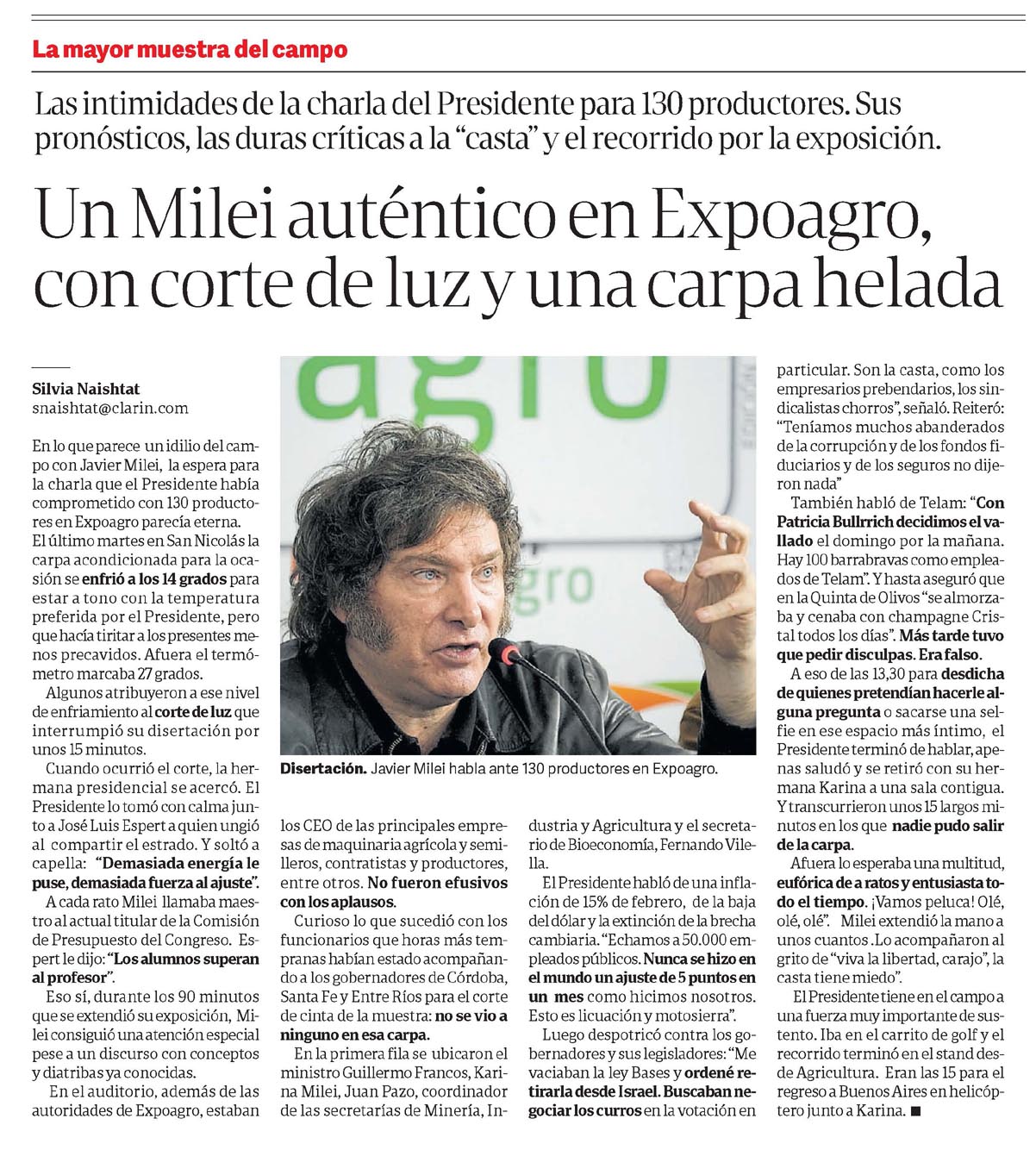Las intimidades de la charla del Presidente para 130 productores. Sus pronósticos, las duras críticas a la «casta» y el recorrido por la exposición.snaishtat@clarin.comEn lo que parece un idilio del campo con Javier Milei, la espera para la charla que el Presidente había comprometido con 130 productores en Expoagro parecía eterna.El último martes en San Nicolás la carpa acondicionada para la ocasión se enfrió a los 14 grados para estar a tono con la temperatura preferida por el Presidente, pero que hacía tiritar a los presentes menos precavidos. Afuera el termómetro marcaba 27 grados.Algunos atribuyeron a ese nivel de enfriamiento al corte de luz que interrumpió su disertación por unos 15 minutos.Cuando ocurrió el corte, la hermana presidencial se acercó. El Presidente lo tomó con calma junto a José Luis Espert a quien ungió al compartir el estrado. Y soltó a capella: «Demasiada energía le puse, demasiada fuerza al ajuste».A cada rato Milei llamaba maestro al actual titular de la Comisión de Presupuesto del Congreso. Espert le dijo: «Los alumnos superan al profesor».Eso sí, durante los 90 minutos que se extendió su exposición, Milei consiguió una atención especial pese a un discurso con conceptos y diatribas ya conocidas.En el auditorio, además de las autoridades de Expoagro, estaban los CEO de las principales empresas de maquinaria agrícola y semilleros, contratistas y productores, entre otros. No fueron efusivos con los aplausos.Curioso lo que sucedió con los funcionarios que horas más tempranas habían estado acompañando a los gobernadores de Córdoba, Santa Fe y Entre Ríos para el corte de cinta de la muestra: no se vio a ninguno en esa carpa.En la primera fila se ubicaron el ministro Guillermo Francos, Karina Milei, Juan Pazo, coordinador de las secretarías de Minería, Industria y Agricultura y el secretario de Bioeconomía, Fernando Vilella.El Presidente habló de una inflación de 15% de febrero, de la baja del dólar y la extinción de la brecha cambiaria. «Echamos a 50.000 empleados públicos. Nunca se hizo en el mundo un ajuste de 5 puntos en un mes como hicimos nosotros.Esto es licuación y motosierra».Luego despotricó contra los gobernadores y sus legisladores: «Me vaciaban la ley Bases y ordené retirarla desde Israel. Buscaban negociar los curros en la votación en particular. Son la casta, como los empresarios prebendarios, los sindicalistas chorros», señaló. Reiteró: «Teníamos muchos abanderados de la corrupción y de los fondos fiduciarios y de los seguros no dijeron nada» También habló de Telam: «Con Patricia Bullrrich decidimos el vallado el domingo por la mañana.Hay 100 barrabravas como empleados de Telam». Y hasta aseguró que en la Quinta de Olivos «se almorzaba y cenaba con champagne Cristal todos los días». Más tarde tuvo que pedir disculpas. Era falso.A eso de las 13,30 para desdicha de quienes pretendían hacerle alguna pregunta o sacarse una selfie en ese espacio más íntimo, el Presidente terminó de hablar, apenas saludó y se retiró con su hermana Karina a una sala contigua.Y transcurrieron unos 15 largos minutos en los que nadie pudo salir de la carpa.Afuera lo esperaba una multitud, eufórica de a ratos y entusiasta todo el tiempo. ¡Vamos peluca! Olé, olé, olé». Milei extendió la mano a unos cuantos .Lo acompañaron al grito de «viva la libertad, carajo», la casta tiene miedo».El Presidente tiene en el campo a una fuerza muy importante de sustento.Iba en el carrito de golf y el recorrido terminó en el stand desde Agricultura. Eran las 15 para el regreso a Buenos Aires en helicóptero junto a Karina.Disertación. Javier Milei habla ante 130 productores en Expoagro.