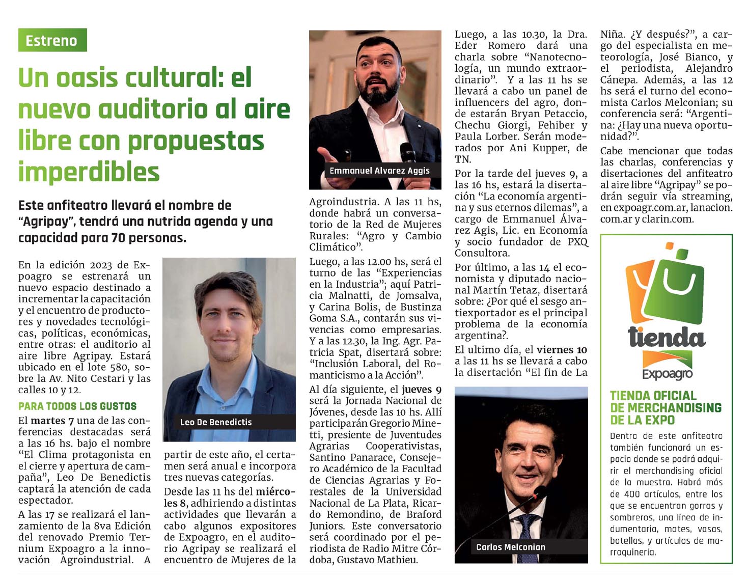 En la edición 2023 de Expoagro se estrenará un nuevo espacio destinado a incrementar la capacitación y el encuentro de productores y novedades tecnológicas, políticas, económicas, entre otras: el auditorio al aire libre Agripay. Estará ubicado en el lote 580, sobre la Av. Nito Cestari y las calles 10 y 12.