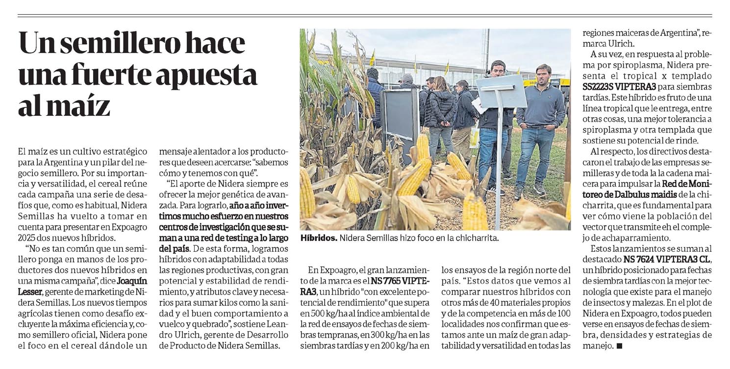 … versatilidad, el cereal reúne cada campaña una serie de desafíos que, como es habitual, Nidera Semillas ha vuelto a tomar en cuenta para presentar en Expoagro 2025 dos nuevos híbridos. «No es tan común que un semillero ponga en manos de los productores dos nuevos híbridos en una misma campaña», dice Joaquín…