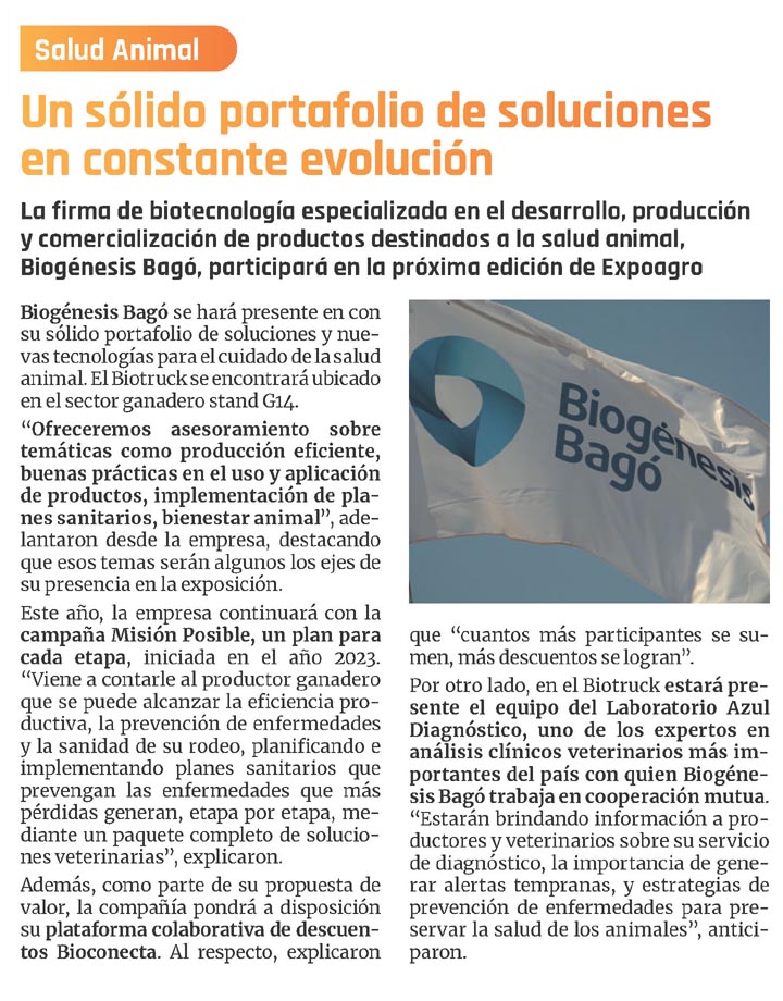La firma de biotecnología especializada en el desarrollo, producción y comercialización de productos destinados a la salud animal, Biogénesis Bagó, participará en la próxima edición de ExpoagroBiogénesis Bagó se hará presente en con su sólido portafolio de soluciones y nuevas tecnologías para el cuidado de la salud animal. El Biotruck se encontrará ubicado en el sector ganadero stand G14. «Ofreceremos asesoramiento sobre temáticas como producción eficiente, buenas prácticas en el uso y aplicación de productos, implementación de planes sanitarios, bienestar animal», adelantaron desde la empresa, destacando que esos temas serán algunos los ejes de su presencia en la exposición.Este año, la empresa continuará con la campaña Misión Posible, un plan para cada etapa, iniciada en el año 2023. «Viene a contarle al productor ganadero que se puede alcanzar la eficiencia productiva, la prevención de enfermedades y la sanidad de su rodeo, planificando e implementando planes sanitarios que prevengan las enfermedades que más pérdidas generan, etapa por etapa, mediante un paquete completo de soluciones veterinarias», explicaron.Además, como parte de su propuesta de valor, la compañía pondrá a disposición su plataforma colaborativa de descuentos Bioconecta. Al respecto, explicaron que «cuantos más participantes se sumen, más descuentos se logran».Por otro lado, en el Biotruck estará presente el equipo del Laboratorio Azul Diagnóstico, uno de los expertos en análisis clínicos veterinarios más importantes del país con quien Biogénesis Bagó trabaja en cooperación mutua. «Estarán brindando información a productores y veterinarios sobre su servicio de diagnóstico, la importancia de generar alertas tempranas, y estrategias de prevención de enfermedades para preservar la salud de los animales», anticiparon.