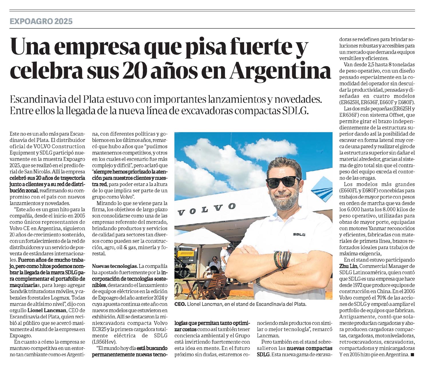 …Este no es un año más para Escandinavia del Plata. El distribuidor oficial de VOLVO Construction Equipment y SDLG participó nuevamente en la muestra Expoagro 2025, que se realizó en el predio ferial de San Nicolás. Allí la empresa celebró sus 20 años de trayectoria junto a clientes y a su red de distribución…