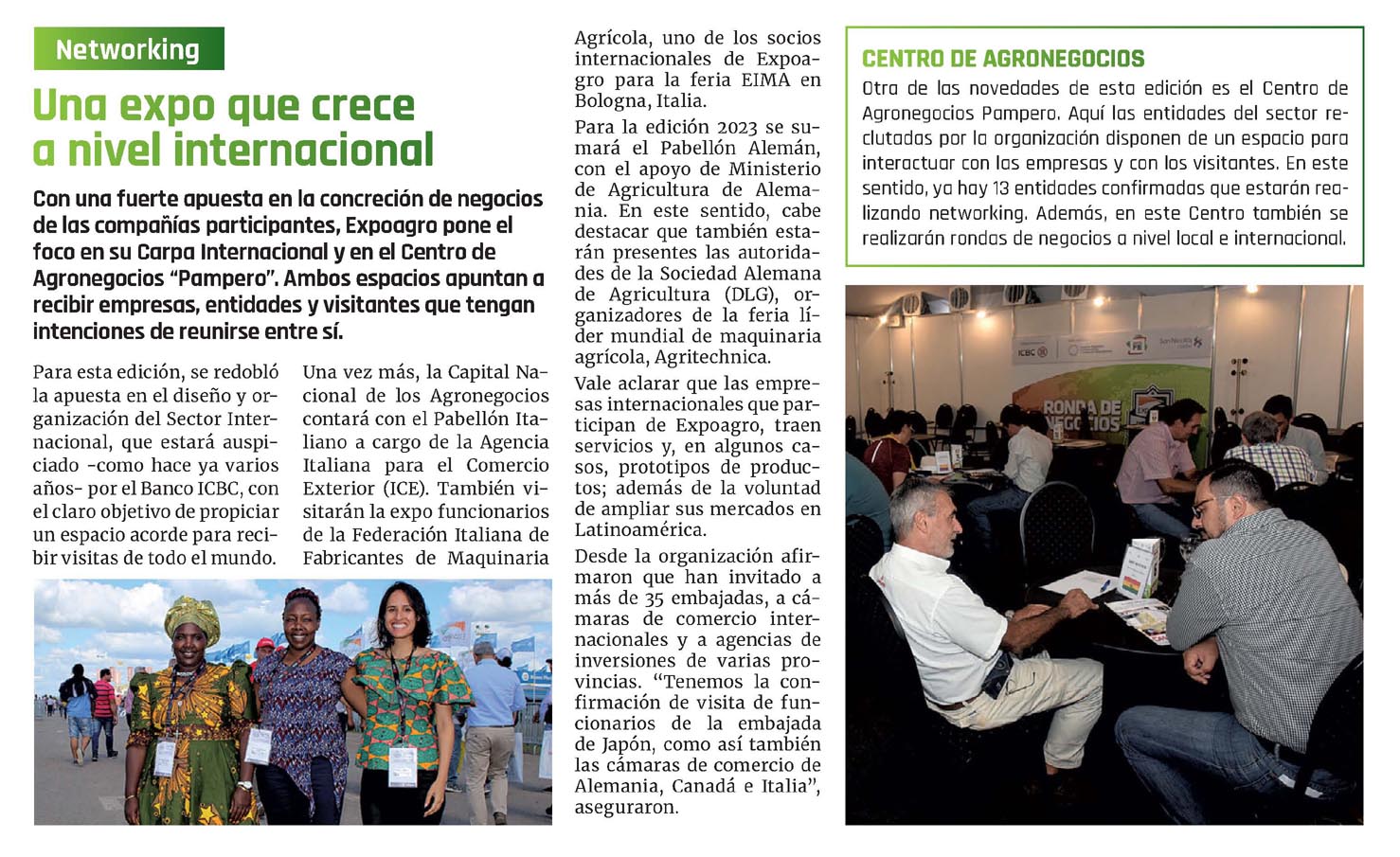 Para la edición 2023 se sumará el Pabellón Alemán, con el apoyo de Ministerio de Agricultura de Alemania. En este sentido, cabe destacar que también estarán presentes las autoridades de la Sociedad Alemana de Agricultura (DLG), organizadores de la feria líder mundial de maquinaria agrícola, Agritechnica.