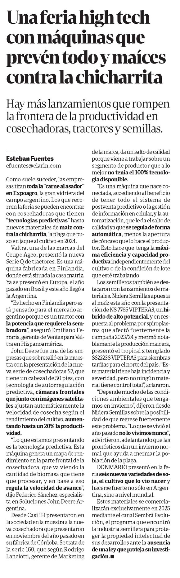 Como suele suceder, las empresas tiran toda la «carne al asador» en Expoagro, la gran vidriera del campo argentino. Los que recorren la feria se pueden encontrar con cosechadoras que tienen «tecnologías predictivas» hasta nuevos materiales de maíz contra la chicharrita, la plaga que puso en jaque al cultivo en 2024.