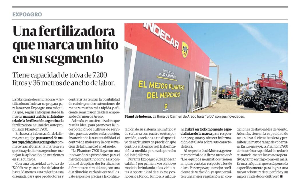Tiene capacidad de tolva de 7.200 litros y 36 metros de ancho de labor.Stand de Indecar. La firma de Carmen de Areco hará «ruido» con sus novedades.La fabricante de sembradoras y fertilizadoras Indecar se prepara para lanzar en Expoagro una máquina que, según anticipan desde la marca, marcará un hito en la industria de la fertilización argentina: la fertilizadora neumática autopropulsada Phantom 7200.En base a la información de la firma, este equipo pasa a ser el de mayor capacidad de su categoría y promete transformar la manera en que los agricultores argentinos manejan la aplicación de nutrientes en sus cultivos.Con una capacidad de tolva de 7200 litros y un ancho de labor de hasta 36 metros, esta máquina está diseñada para que productores y contratistas tengan la posibilidad de cubrir grandes extensiones de manera mucho más rápida y eficiente, remarcaron desde la empresa de Carmen de Areco.Además, es una fertilizadora que resulta ideal para promover la incorporación de cultivos de servicio o puentes verdes en la rotación, favoreciendo la sustentabilidad, el control de malezas y la conservación de la humedad en el suelo.»La Phantom 7200 llega con una innovación sin precedentes para el mercado argentino como es la posibilidad de aplicar dos fertilizantes diferentes en simultáneo, con una distribución variable entre ellos.Esto es posible gracias a la configuración de su sistema neumático y de su barra con cuatro cortes por sección, asociados a un dispositivo de agricultura de precisión que controla en tiempo real la dosificación a medida para cada porción del lote», dijeron.Durante Expoagro 2024, Indecar exhibirá por primera vez el nuevo modelo, brindando a los visitantes la oportunidad de subirse y conocerlo a fondo. Junto a la máquina habrá en todo momento especialistas de la marca para responder preguntas y ofrecer información detallada sobre sus características.Al respecto, José Morena, gerente comercial de la firma mencionó: «Los equipos neumáticos tienen amplias ventajas respecto a los de disco. Por empezar, un mejor coeficiente de variación, ya que permiten una mejor regulación en condiciones desfavorables de viento.Además, tienen la capacidad de neutralizar el ?efecto bandera? y permiten un mayor rango de cobertura.En los ensayos, la Phantom 7200 demostró su capacidad de reducir sustancialmente los costos operativos, tanto en trigo como en maíz.Es una máquina que está pensada específicamente para lograr una mayor cobertura de superficie y un mayor rinde de los cultivos».