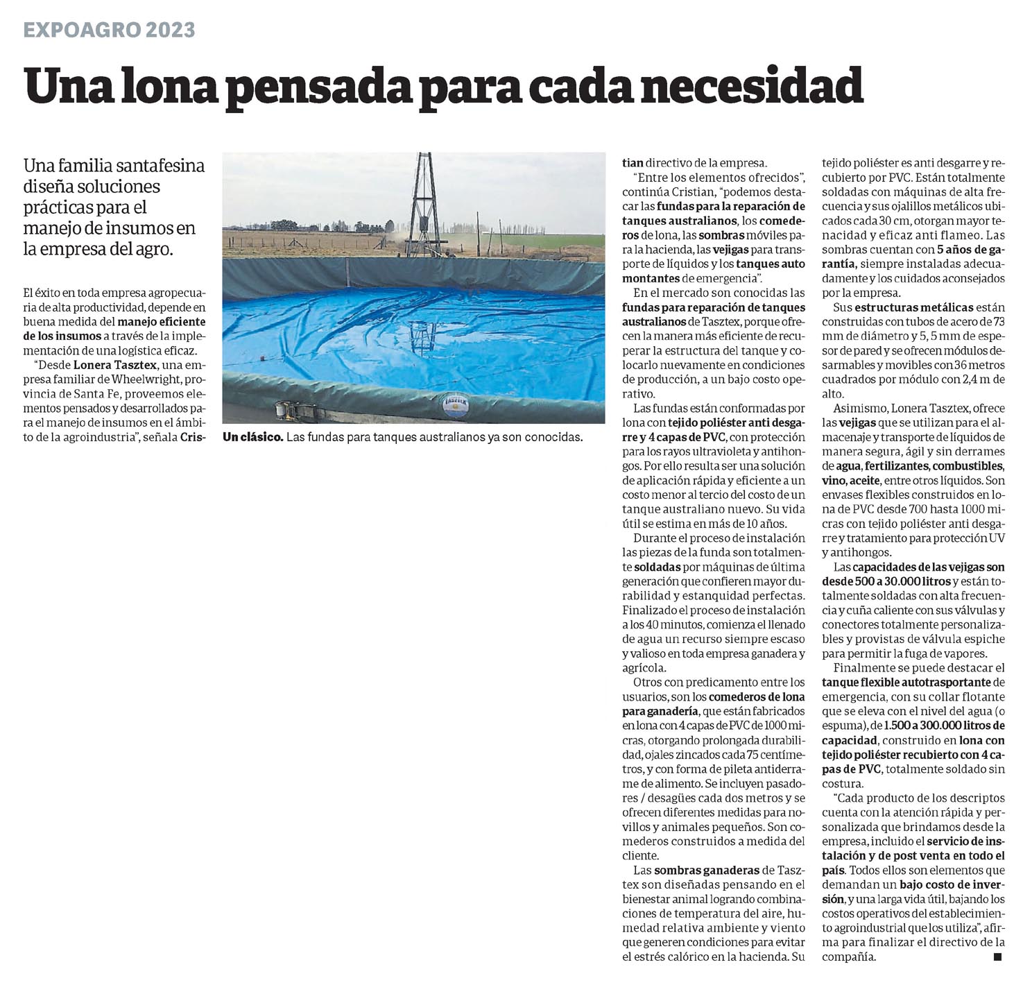 «Entre los elementos ofrecidos», continúa Cristian, «podemos destacar las fundas para la reparación de tanques australianos, los comederos de lona, las sombras móviles para la hacienda, las vejigas para transporte de líquidos y los tanques auto montantes de emergencia».