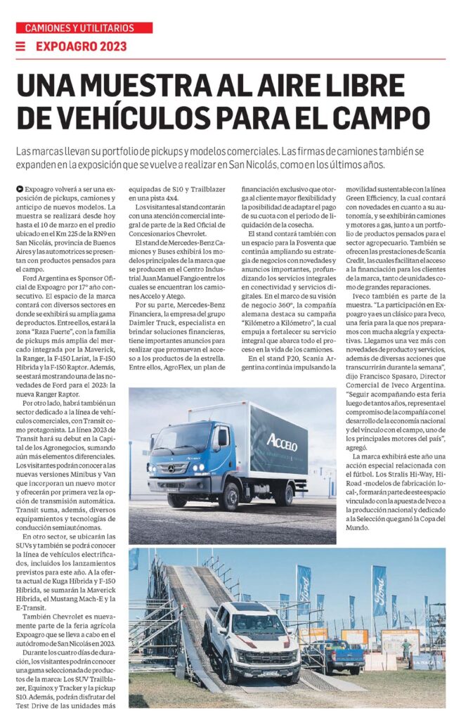 Expoagro volverá a ser una exposición de pickups, camiones y anticipo de nuevos modelos. La muestra se realizará desde hoy hasta el 10 de marzo en el predio ubicado en el Km 225 de la RN9 en San Nicolás, provincia de Buenos Aires y las automotrices se presentan con productos pensados para el campo.