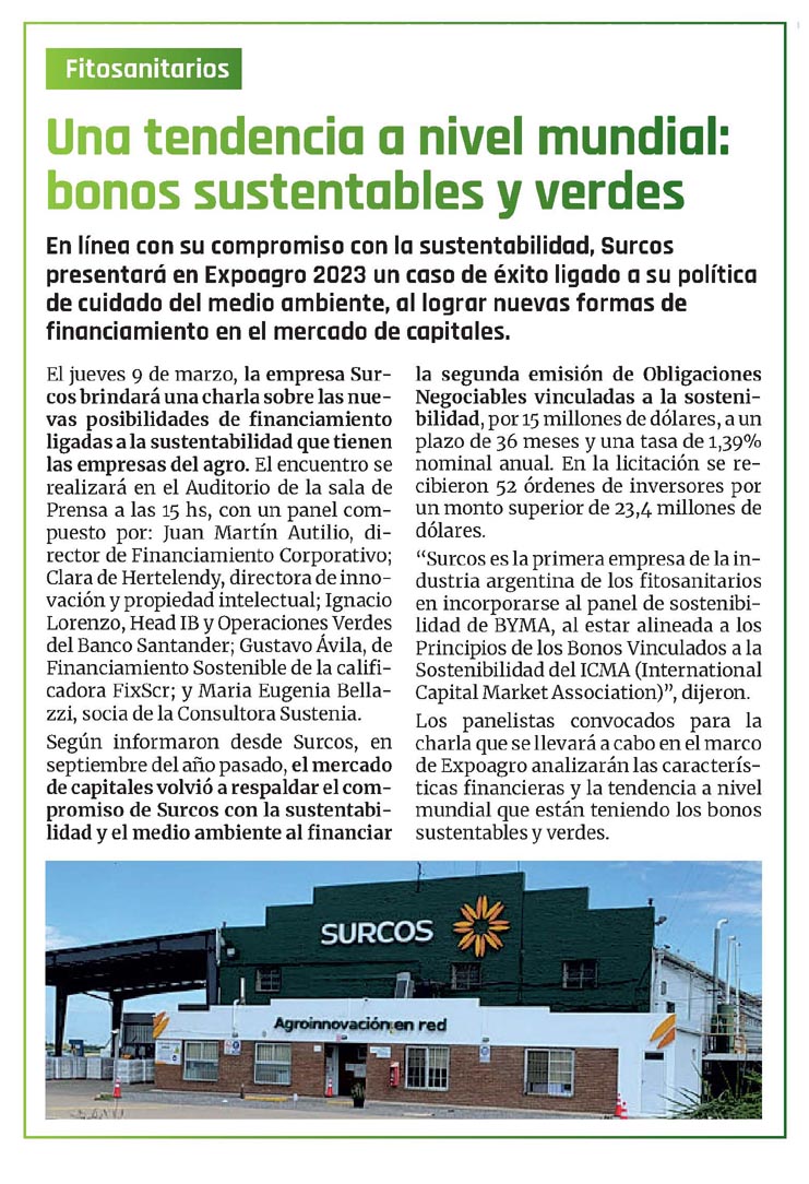 El jueves 9 de marzo, la empresa Surcos brindará una charla sobre las nuevas posibilidades de financiamiento ligadas a la sustentabilidad que tienen las empresas del agro. El encuentro se realizará en el Auditorio de la sala de Prensa a las 15 hs, con un panel compuesto por: Juan Martín Autilio, director de Financiamiento Corporativo; Clara de Hertelendy, directora de innovación y propiedad intelectual; Ignacio Lorenzo, Head IB y Operaciones Verdes del Banco Santander; Gustavo Ávila, de Financiamiento Sostenible de la calificadora FixScr; y María Eugenia Bellazzi, socia de la Consultora Sustenia. Según informaron desde Surcos, en septiembre del año pasado, el mercado de capitales volvió a respaldar el compromiso de Surcos con la sustentabilidad y el medio ambiente al financiar la segunda emisión de Obligaciones Negociables vinculadas a la sostenibilidad, por 15 millones de dólares, a un plazo de 36 meses y una tasa de 1,39% nominal anual. En la licitación se recibieron 52 órdenes de inversores por un monto superior de 23,4 millones de dólares.