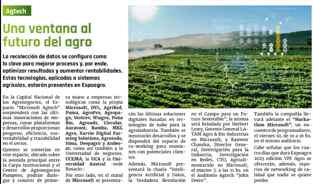 En la Capital Nacional de los Agronegocios, el Espacio “Microsoft Agtech” sorprenderá con las últimas innovaciones de empresas, cuyas plataformas y desarrollos proporcionan progreso, eficiencia, sustentabilidad y trazabilidad en el sector. Quienes se sumerjan en este espacio, ubicado sobre la avenida principal entre la Carpa Institucional y el Centro de Agronegocios Pampero, podrán dialogar y conocer de primera mano a empresas tecnológicas como la propia Microsoft, DVL, AgriRed, Puma, AgroPro, Agropa – go, Vertrev, Wiagro, Puna Bio, Agroads, Circular, Auravant, Bamba, MKL Agro, Xarvio Digital Farming Solutions, Agrotodo, Sima, Deepagro y Andes – at; como así también a la Universidad de negocios, UCEMA; la UCA y la Universidad Austral -sede Rosario-. Por otro lado, en el stand de Microsoft se presenta – También la compañía llevará adelante el “Hackathon Microsoft”, un encuentro de programadores, el viernes 10, de 10 a 16 hs. en el mismo auditorio. Cabe señalar que los cuatro días que dura Expoagro 2023 edición YPF Agro se ofrecerán, además, espacios de networking de calidad que nadie se quiere perderán las últimas soluciones digitales basadas en tecnologías de nube para la agroindustria. También se mostrarán desarrollos y se dispondrá del espacio de coworking para reuniones con potenciales clientes. Además, Microsoft presentará la charla “Inteligencia Artificial y Datos, la Verdadera Revolución en el Campo para un Futuro Sostenible”; la misma será brindada por Herbert Lewy, Gerente General LATAM Agro & Bio Industrias en Microsoft, y Ranveer Chandra, Director Gene – ral, Investigación para la Industria, Investigación en Redes, CTO, Agroalimentación en Microsoft, el martes 7, a las 11 hs. en el Auditorio Agtech “John Deere”.