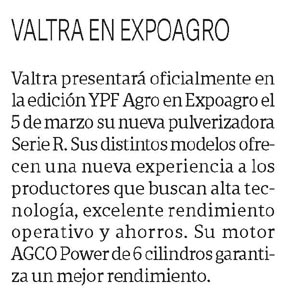 Valtra presentará oficialmente en la edición YPF Agro en Expoagro el 5 de marzo su nueva pulverizadora Serie R. Sus distintos modelos ofrecen una nueva experiencia a los productores que buscan alta tecnología, excelente rendimiento operativo y ahorros. Su motor AGCO Power de 6 cilindros garantiza un mejor rendimiento.