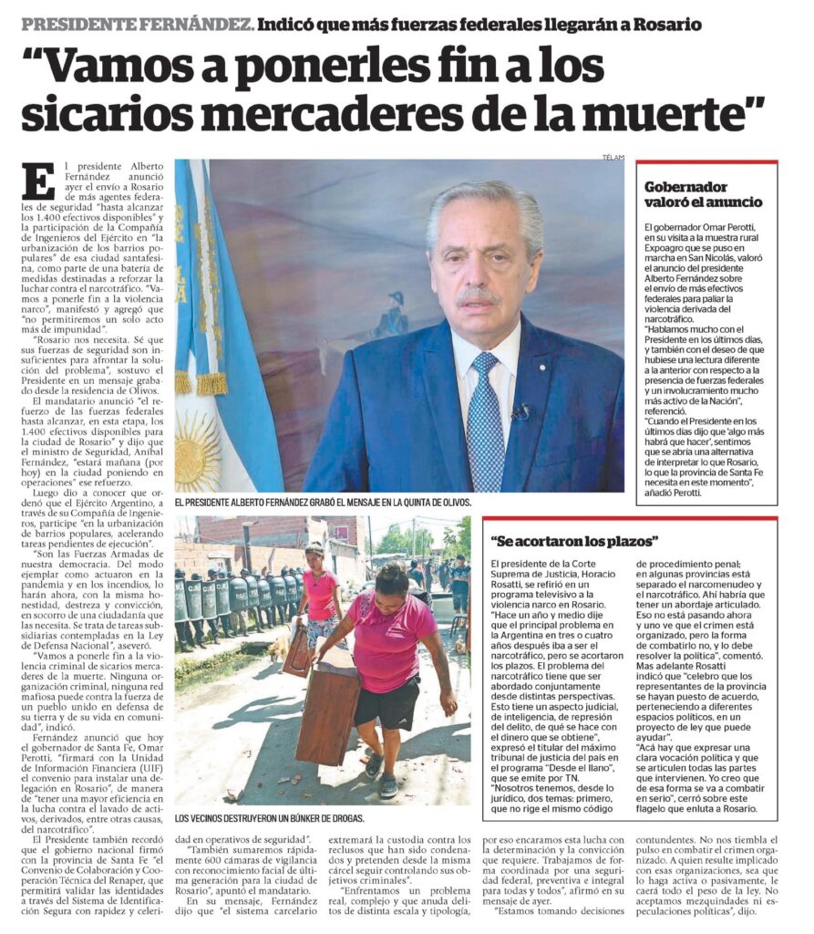 El presidente Alberto Fernández anunció ayer el envío a Rosario de más agentes federales de seguridad «hasta alcanzar los 1.400 efectivos disponibles» y la participación de la Compañía de Ingenieros del Ejército en «la urbanización de los barrios populares» de esa ciudad santafesina, como parte de una batería de medidas destinadas a reforzar la luchar contra el narcotráfico. «Vamos a ponerle fin a la violencia narco», manifestó y agregó que «no permitiremos un solo acto más de impunidad».