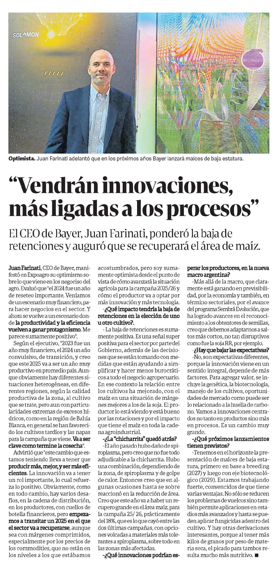 …Juan Farinati, CEO de Bayer, manifestó en Expoagro su optimismo sobre lo que viene en los negociso del agro. Evaluó que «el 2024 fue un año de reseteo importante. Veníamos de un escenario muy financiero,…