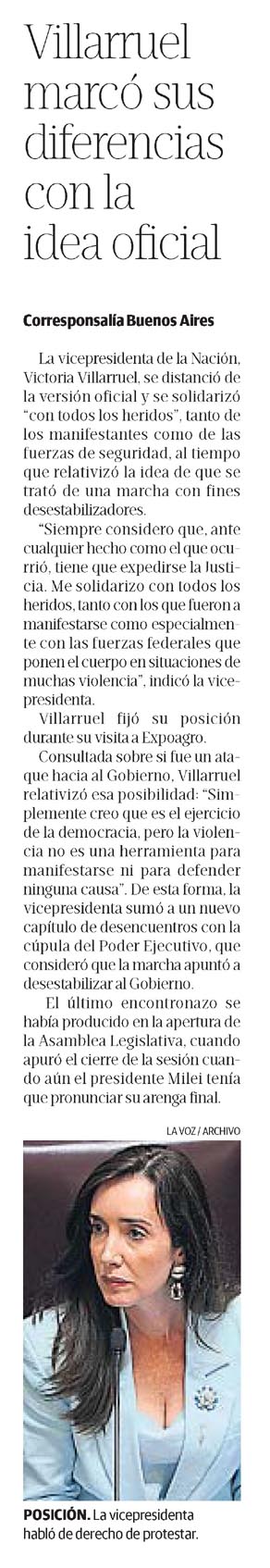 … como especialmente con las fuerzas federales que ponen el cuerpo en situaciones de mucha violencia”, indicó la vicepresidenta durante su visita a Expoagro. Consultada sobre si fue un ataque hacia el Gobierno, Villarruel relativizó esa posibilidad: “Simplemente creo que es el ejercicio de la democracia,…