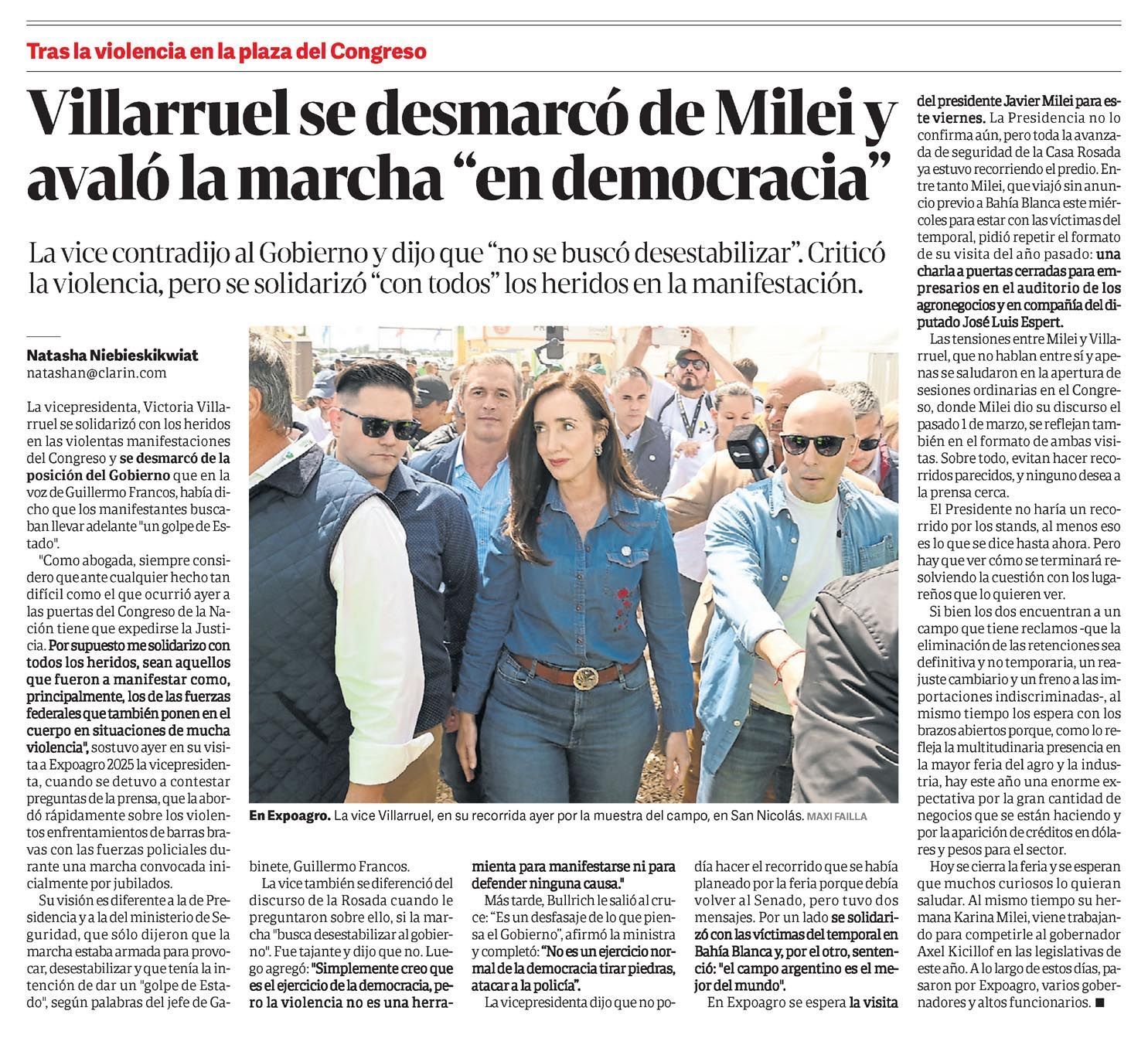 … manifestar como, principalmente, los de las fuerzas federales que también ponen en el cuerpo en situaciones de mucha violencia», sostuvo ayer en su visita a Expoagro 2025 la vicepresidenta, cuando se detuvo a contestar preguntas de la prensa, que la abordó rápidamente sobre los violentos enfrentamientos de barras bravas…
