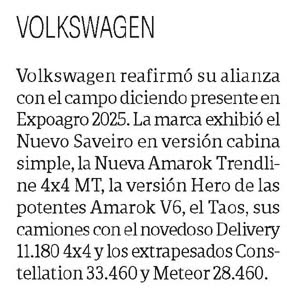 Volkswagen reafirmó su alianza con el campo diciendo presente en Expoagro 2025. La marca exhibió el Nuevo Saveiro en versión cabina simple, la Nueva Amarok Trendline 4×4 MT, la versión Hero de las potentes Amarok V6, el Taos