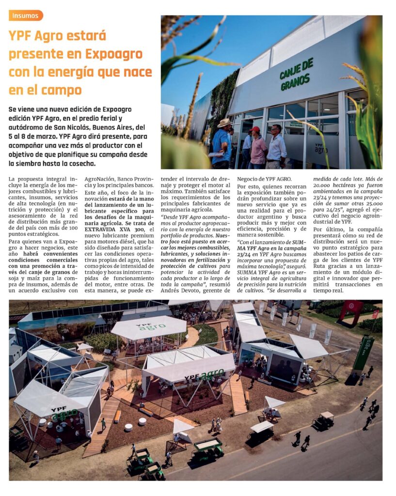 Se viene una nueva edición de Expoagro edición YPF Agro, en el predio ferial y autódromo de San Nicolás, Buenos Aires, del 5 al 8 de marzo. YPF Agro dirá presente, para acompañar una vez más al productor con el objetivo de que planifique su campaña desde la siembra hasta la cosecha.La propuesta integral incluye la energía de los mejores combustibles y lubricantes, insumos, servicios de alta tecnología (en nutrición y protección) y el asesoramiento de la red de distribución más grande del país con más de loo puntos estratégicos.Para quienes van a Expoagro a hacer negocios, este año habrá convenientes condiciones comerciales con una promoción a través del canje de granos de soja y maíz para la compra de insumos, además de un acuerdo exclusivo con AgroNación, Banco Provincia y los principales bancos. Este año, el foco de la innovación estará de la mano del lanzamiento de un lubricante específico para los desafíos de la maquinaria agrícola. Se trata de EXTRAVIDA XVA 300, el nuevo lubricante premium para motores diésel, que ha sido diseñado para satisfacer las condiciones operativas propias del agro, tales como picos de intensidad de trabajo y horas ininterrumpidas de funcionamiento del motor, entre otras. De esta manera, se puede extender el intervalo de drenaje y proteger el motor al máximo. También satisface los requerimientos de los principales fabricantes de maquinaria agrícola.»Desde YPF Agro acompañamos al productor agropecuario con la energía de nuestro portfolio de productos. Nuestro foco está puesto en acercar los mejores combustibles, lubricantes, y soluciones innovadoras en fertilización y protección de cultivos para potenciar la actividad de cada productor a lo largo de toda la campaña», resumió Andrés Devoto, gerente de Negocio de YPF AGRO.Por esto, quienes recorran la exposición también podrán profundizar sobre un nuevo servicio que ya es una realidad para el productor argentino y busca producir más y mejor con eficiencia, precisión y de manera sostenible.»Con el lanzamiento de SUM- MA YPF Agro en la campaña 23/24 en YPF Agro buscamos incorporar una propuesta de máxima tecnología»aseguró. SUMMA YPF Agro es un servicio integral de agricultura de precisión para la nutrición de cultivos. «Se desarrolla a medida de cada lote. Más de 20.000 hectáreas ya fueron ambientadas en la campaña 23/24 y tenemos una proyección de sumar otras 25.000 para 24/25», agregó el ejecutivo del negocio agroin- dustrial de YPF.Por último, la compañía presentará cómo su red de distribución será un nuevo punto estratégico para abastecer los patios de carga de los clientes de YPF Ruta gracias a un lanzamiento de un módulo digital e innovador que permitirá transacciones en tiempo Real.
